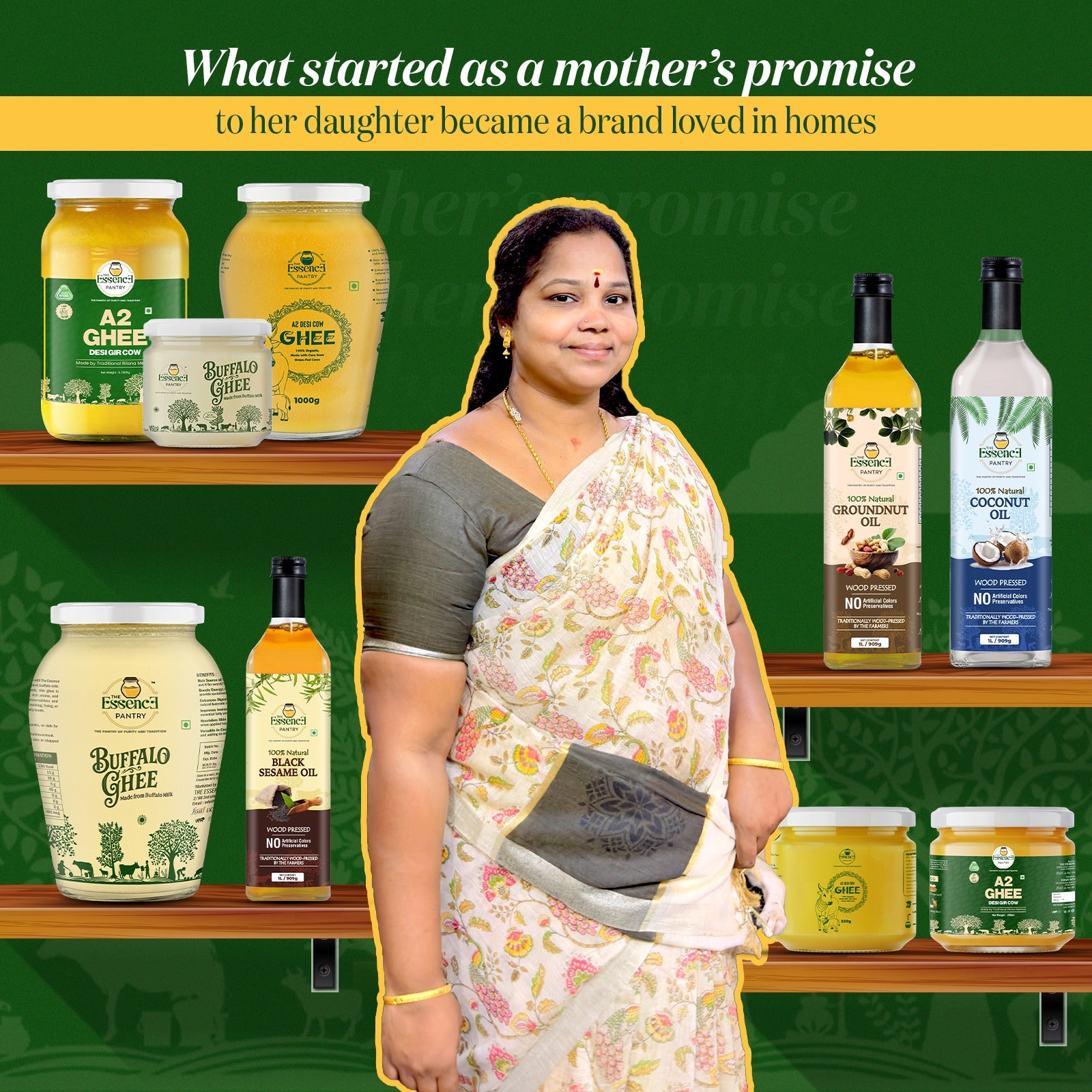 You can buy A2 Cow & Buffalo Ghee, cold-pressed oils (groundnut, sesame, coconut), seeds, dry fruits, and more premium pantry staples.Â
